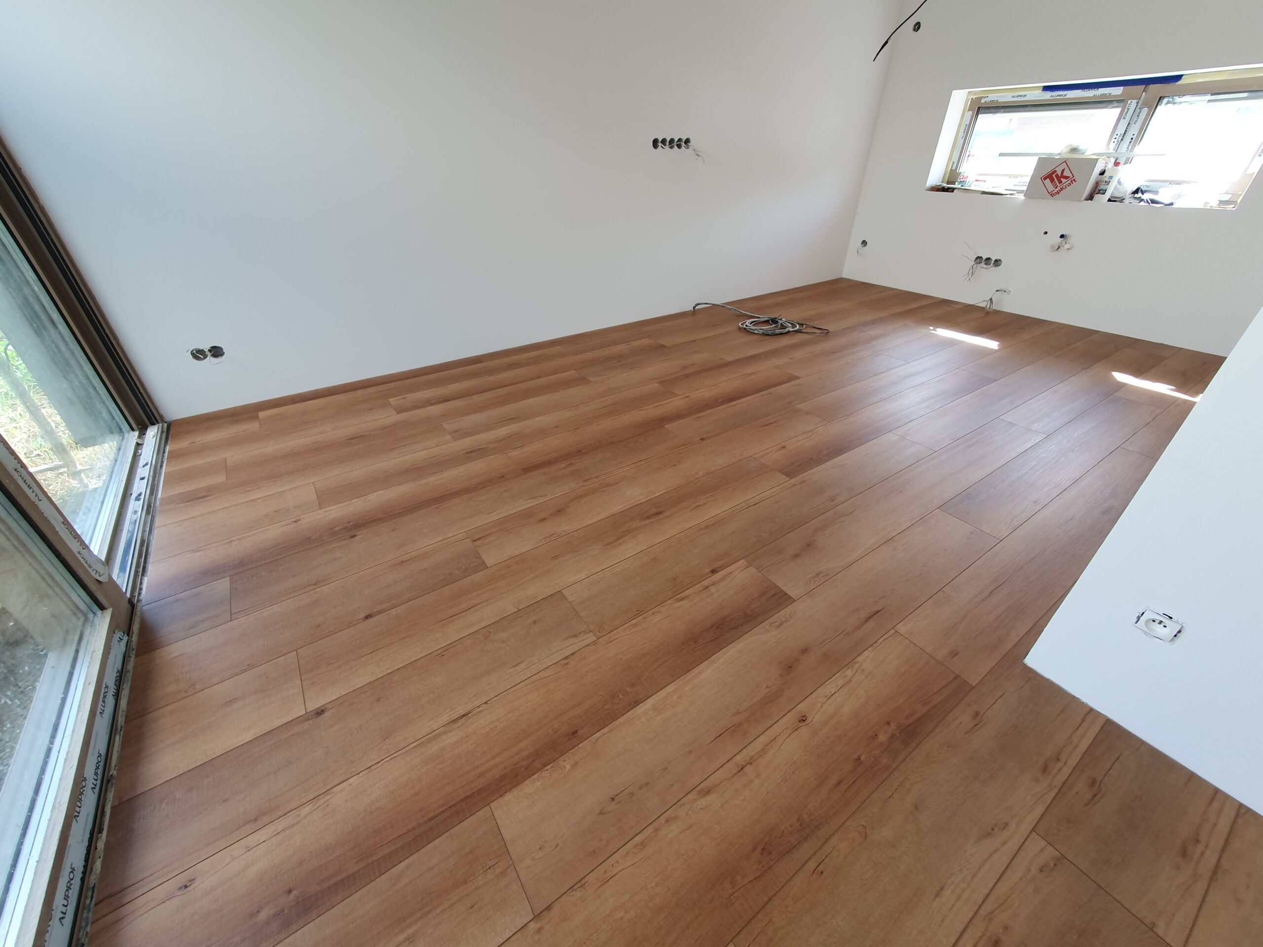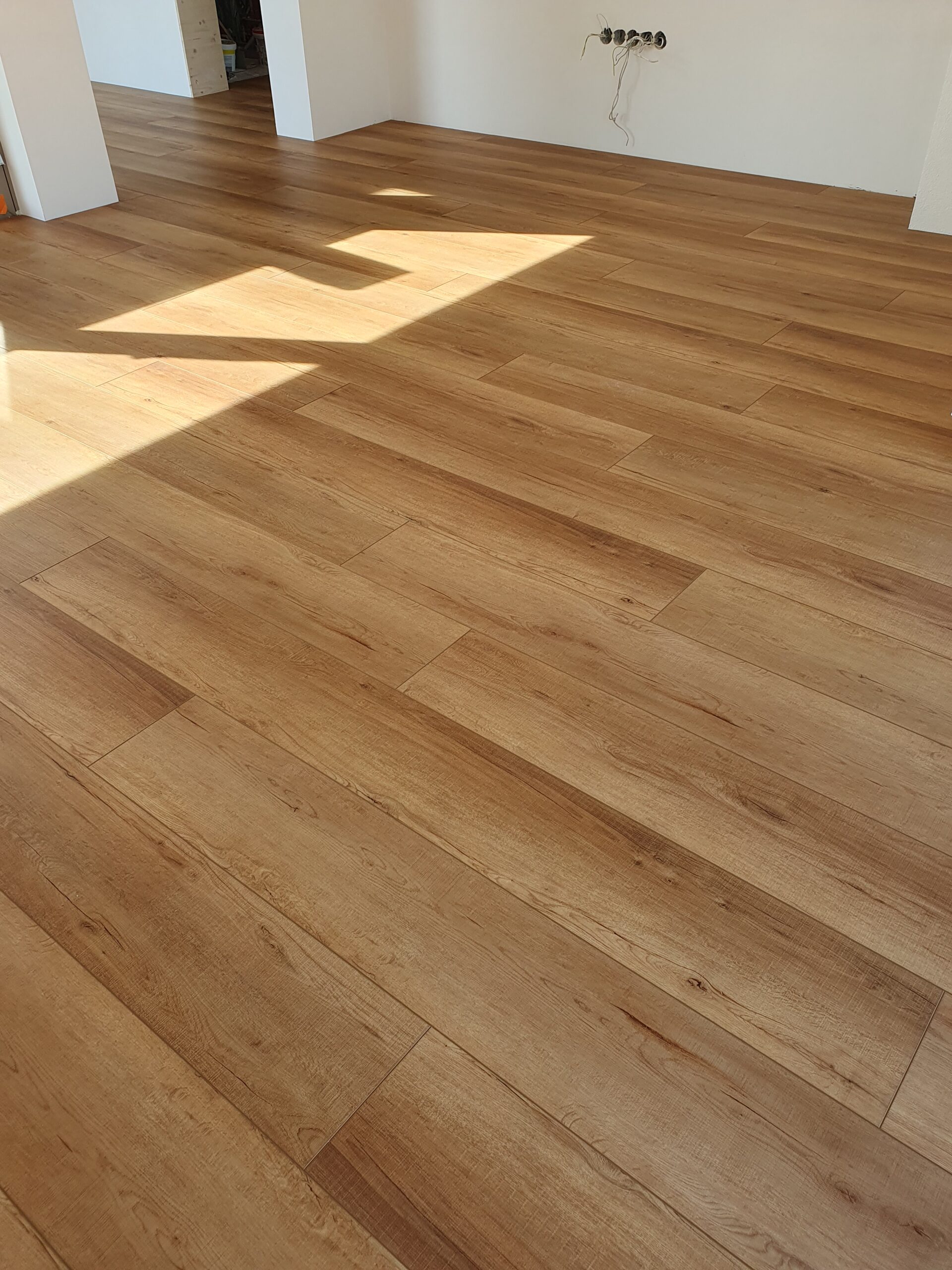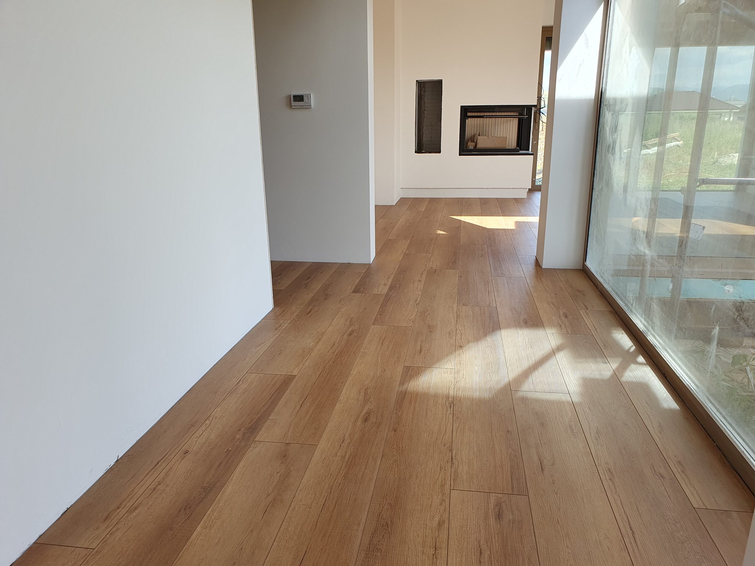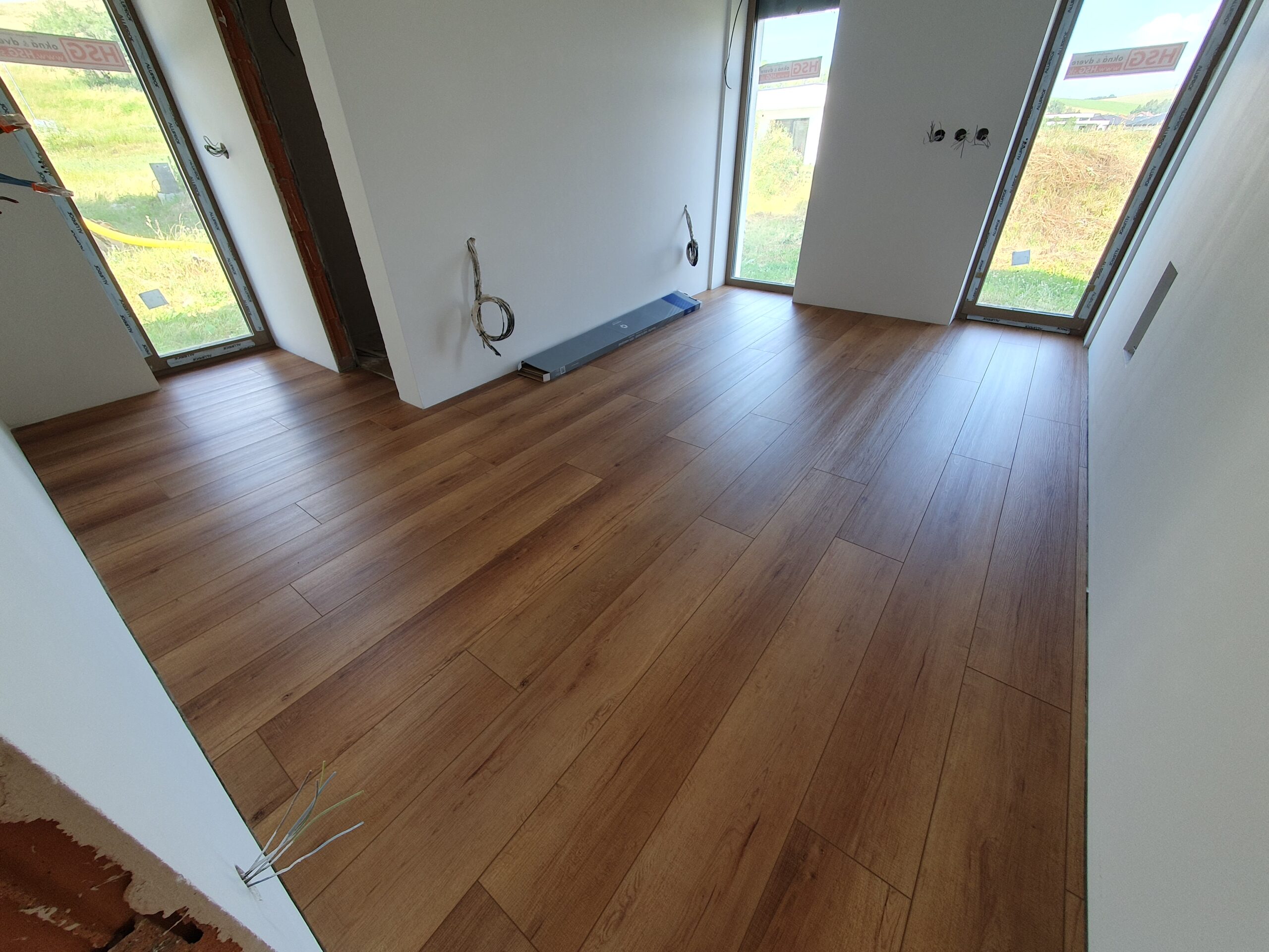 Pri obhliadke u klienta sme zistili nerovnosť podkladu. Po dohode so stavebníkom o zmene rozsahu prác sme podklad prebrúsili, napenetrovali a nivelizovali samonivelizačnou hmotou. Po jej vyschnutí sme namontovali kompozitnú podlahu COREtec®, ktorá je ideálna na vykurované potery a umožňuje montáž bez prechodových líšt medzi izbami.