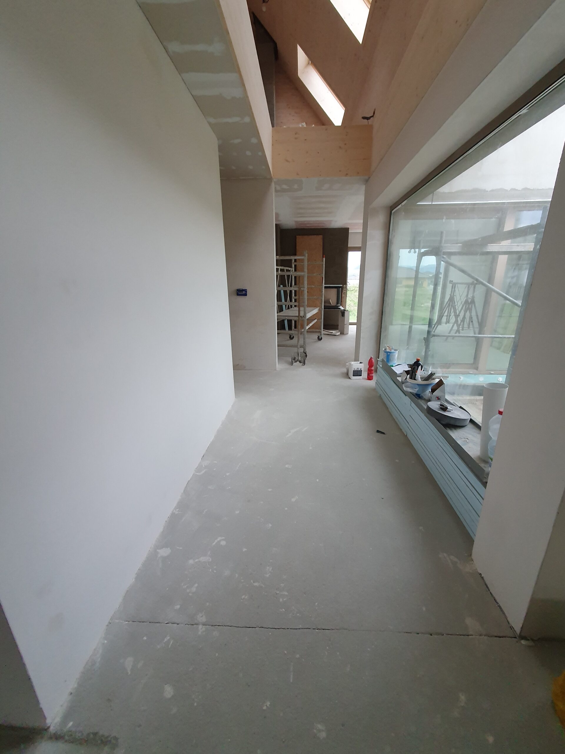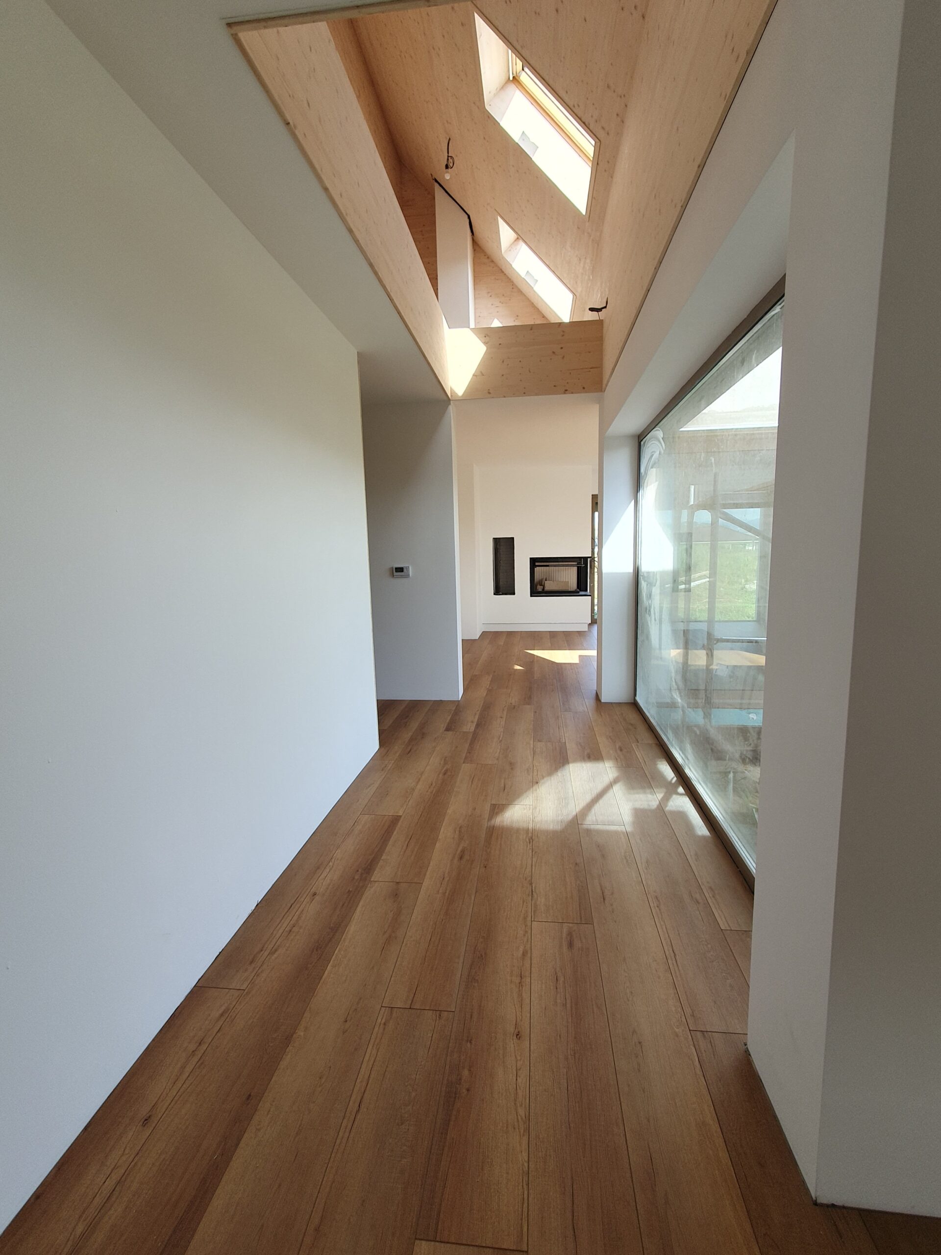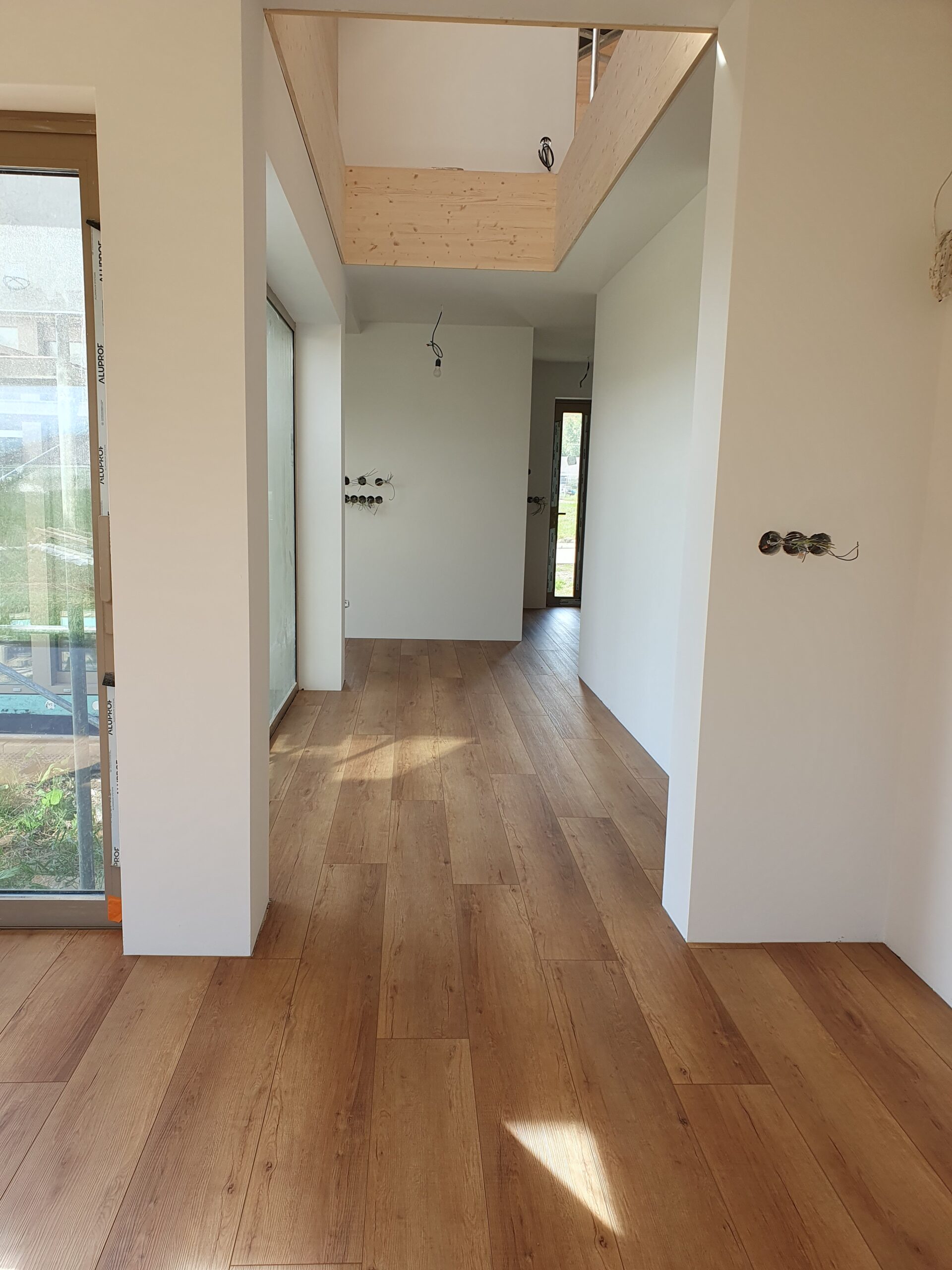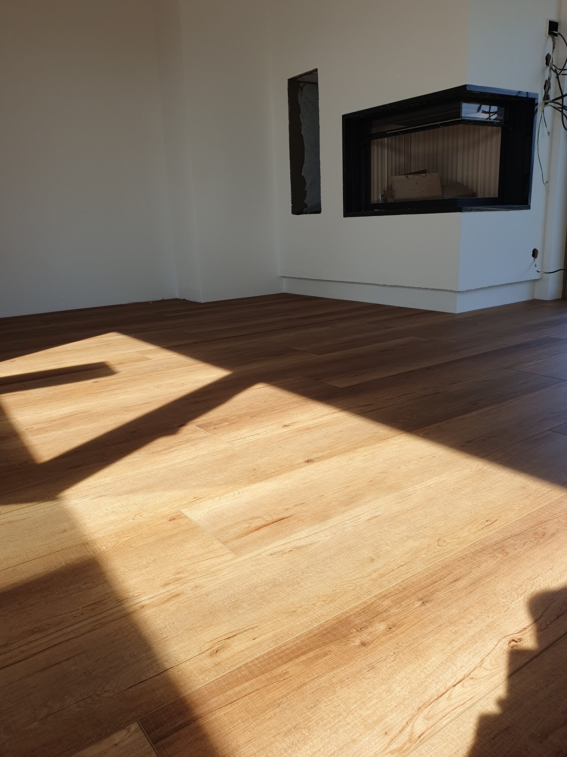 Pri obhliadke u klienta sme zistili nerovnosť podkladu. Po dohode so stavebníkom o zmene rozsahu prác sme podklad prebrúsili, napenetrovali a nivelizovali samonivelizačnou hmotou. Po jej vyschnutí sme namontovali kompozitnú podlahu COREtec®, ktorá je ideálna na vykurované potery a umožňuje montáž bez prechodových líšt medzi izbami.